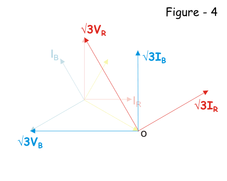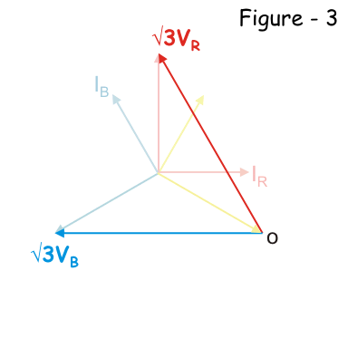 现在假设在系统的黄色阶段有一个接地故障。理想情况下,黄色相位的电压即黄色相位对地电压变为零。这样,系统的零点在黄色相位矢量的尖端移动,如下图-3所示。因此,电压在健康阶段(红色和蓝色)变成原来的3倍根号。