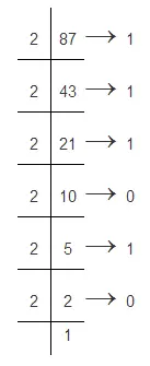 假设我们在转换十进制数(87)10.我们将87划分为2,并获得43作为商品,1作为其余部分。如下所示,这些剩余物写在旁边。
