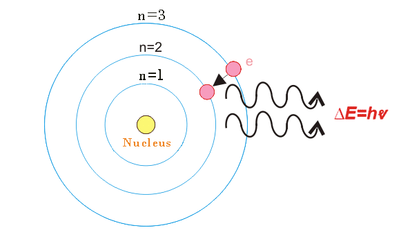 另一方面,当电子从较高能量水平的轨道跳跃到较低能量水平的轨道时,电子释放小包中的能量。这些小型数据包被称为Quanta.或光子。光子的能量由,在哪里,