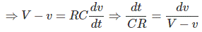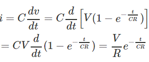 所以初始电流是V/R。现在电压逐渐在电容器上形成,这个形成的电压在极性的相反电池.因此当前的在电路中逐渐减小。当电压穿过电容器当电池的电压相等且相反时,电流为零。在充电过程中,电容器两端的电压逐渐增加。让我们考虑在任意时刻t,通过电容器的电压的增加速率为dv/dt,此时通过电容器的电流为