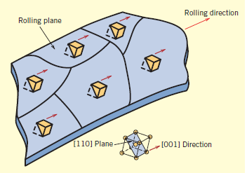 这是为了将钢的厚度从0.1 mm减少到2 mm,这是热轧无法达到的。在此过程中,在精心控制的条件下,在轧制方向上实现了最佳磁特性。这个方向也称为Goss织构(110)[001],这是滚动方向上易磁化的方向。如下图所示。晶粒取向钢不用于旋转电机中betway网页版磁场在薄板平面内,但磁场与滚动方向的夹角不断变化。为此目的使用非晶粒取向硅钢。