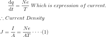 我们用J和J = I/A表示电流密度。在这里,“我”是均匀分布电流是由导体的横截面积如果总N的电子通过导体的横截面在时间T,那么不就是电荷转移通过截面在同一时间T e是电子的电荷库仑