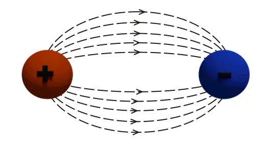 现在,让我们把一个带正电荷的+ Q库仑物体和一个带负电荷的- Q库仑物体放在一起,如下所示。让我们在这两个带电物体之间的任意一点放置一个单位正电荷。单位正电荷将受到带负电荷物体的引力和带正电荷物体的斥力。由于引力和斥力的影响,单位正电荷从+ Q带电物体的中心沿曲线移动到- Q带电物体的中心。考虑其他的力线,我们可以这样画电场。