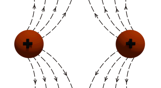 现在,让我们把两个带正电荷的+ Q库仑物体并排放置,如下所示。让我们在任意带电物体的任意一点上放一个单位正电荷。单位正电荷将受到单位正电荷所在的+ Q电荷的排斥力。单位正电荷也受到附近+ Q电荷的另一个排斥力。由于受到两侧这两种斥力的影响,单位正电荷会远离两个+ Q电荷,如下图所示。考虑其他的力线,我们可以这样画电场。