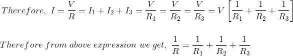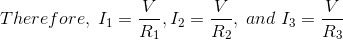 假设有三个电阻R1, R2,和R3.在a上平行连接电压源V(伏特),如图所示。设电流I(安培)为电路总电流,分为电流I1,我2,和我3.流经R1, R2,和R3.分别。根据欧姆定律: