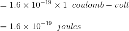 从能量的表达式中,我们可以写出跨越an所需的能量或需要做的功电场总电压V乘以一个电荷Q库仑等于QV库仑伏特或焦耳。现在我们知道电子的电荷是- 1。6 × 10-19年考虑它穿过了总电压为1v的电场。那么要做的总功是电子的电荷× 1v。