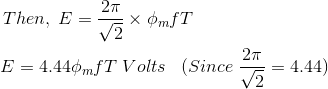 随着电流源对于原液是正弦的,它所引起的磁通也将是正弦的。因此,通量的函数可以看作是正弦函数。从数学上讲,这个函数的导数将给出一个关于通量链对时间的变化率的函数。后一个函数是余弦函数,因为d(sinθ)/dt = cosθ。如果我们推导均方根值将余弦波与绕组匝数相乘,即可得到该绕组感应电动势均方根值的表达式。这样,我们可以很容易地推出变压器电动势方程.
