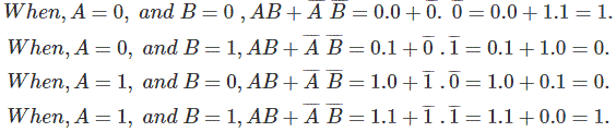 逻辑XNOR操作由⊙表示。这是一个被圆圈包围的点。变量A和B之间的XNOR操作的表达式表示为⊙B。
