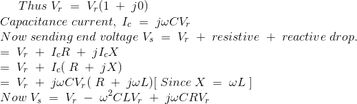 这个电容的充电电流导致线路上的电压降电感器与发送端电压相的传输系统的。当我们向线路负载端移动时,电压降持续增加,随后,接收端电压趋向于比施加电压更大,从而导致所谓的现象电力系统中的费兰提效应.我们用下面的相量图来说明这一点。