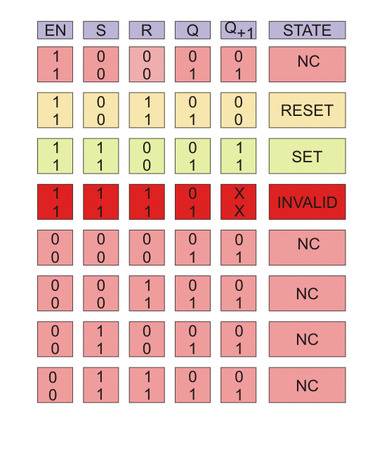 这真理表对于Gated SR锁存器或门控SR触发器已经显示在下表中。