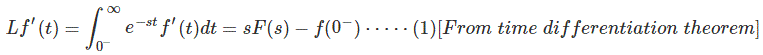 初始值定理和最终值定理在一起称为限制定理。初始值定理通常称为IVT。它将使我们能够在时间t =(0+)对于给定的转换功能(LAPLACE)而不使我们更加努力地找到f(t),在这种情况下是一个繁琐的过程。