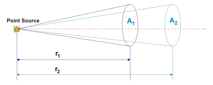辐照度总是遵循平方反比定律。假设从一个点源,辐射通量被a的两个表面接收1和一个2它们的表面积相等。它们被放在r处1和r2距离。