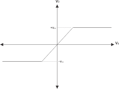 这意味着,输出电压V0.运算放大器无法达到-V以下CC.以上V.CC.。在这个范围内0.与输入差分电压V线性成比例D.。这可以是图形方式表示的,