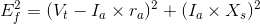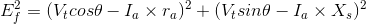 随着电枢的方向与端子电压的方向相反电压下降将是-i.一种R.一种因此,总电压降是(vT.cosθ - 我一种R.一种)沿电枢电流。类似地,我们可以计算电压沿垂直于电枢电流的方向落下。总电压降出现(vT.Sinθ - I.一种XS.)。从三角形BOD中的第一个相位图中,我们可以将励磁EMF的表达写入