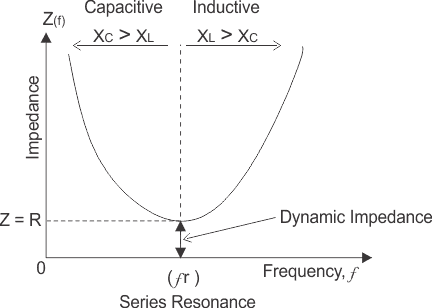 在串联RLC电路中的谐振,两个电抗变得相等并互相抵消。因此,在谐振系列RLC电路中,对电流流的反对仅是由于电阻。在R.esonance, the total impedance of series RLC circuit is equal to resistance i.e Z = R, impedance has only real part but no imaginary part and this impedance at resonant frequency is called dynamic impedance and this dynamic impedance is always less than impedance of series RLC circuit. Before series resonance i.e before frequency, fR.电容电抗主导和在共振之后,电感抗抵抗力主导和谐振,电路纯粹是电阻电路,导致大量电流通过电路循环。