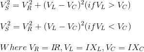 RLC电路中的总电压不等于通过电阻、电感和电容的电压的代数和;但它是一个矢量和,因为在电阻的情况下,电压和电流是同相的,对于电感,电压超前电流90o对于电容器来说,电压比电流落后90o(根据冰人艾利).