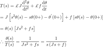 7)由于施加扭矩T抵抗轴承摩擦F,旋转内轴J的轴旋转成角θ。找到系统的传递函数。