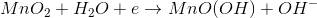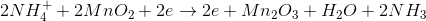 在Leclanche电池中氯化铵(NH4.Cl)以NH形式存在于电解质混合物中4.+和Cl.-.在阴极MnO2将减少到Mn2O.3.与铵离子反应(NH4.+)。除了mn2O.3.该反应也产生氨(NH3.)和水(h20)。