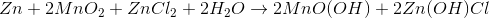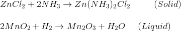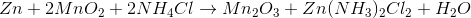在锌碳电池中,氨气进一步与氯化锌(ZnCl2)生成固态氯化锌铵和气态氢与二氧化锰反应生成固态三氧化二锰和水。这两种反应阻止了电池放电过程中气体压力的形成。